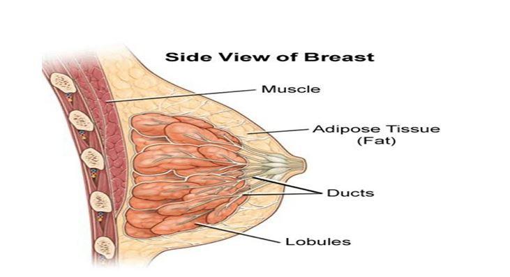 - Made up of connective tissue, fat, and breast tissue (milk glands or mammary glands).